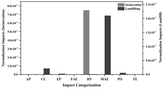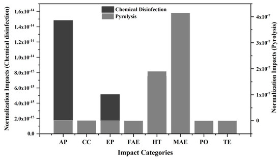 The normalized impacts for landfilling and incineration are represented in Figure 7. In parallel, Figure 8 represents the normalized impacts of pyrolysis and chemical treatment. Due to the great difference in impact values, two scales are used in both figures, each referred to a different treatment process.