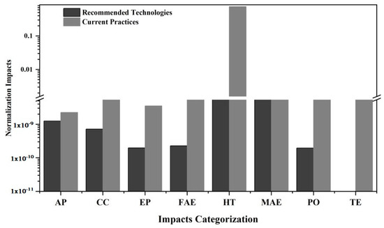 Eight impact categories are included the analysis, according to CML baseline scenario. Normalized data are compared to assess the relative relevance of each impact category. Normalized values, referred to all the considered categories and to each treatment process included in the analysis, are reported in Table 3.