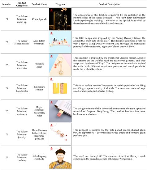 This study is based on the sample sources of the Palace Museum official flagship store on Taobao [37,38]. The cultural and creative products in this museum are divided into seven categories: The Palace Museum make-up (P1), the Palace Museum dolls (P2), the Palace Museum souvenirs (P3), the Palace Museum handbooks (P4), the Palace Museum stationery (P5), the Palace Museum jewelry (P6), the Palace Museum clothing (P7). Taking cultural and creative products with the highest sales volume in their respective categories in 2018 as samples, graphic cards were encoded and collated (Figure 2), which would serve as the test samples of cultural and creative products in the formal questionnaire, in order to facilitate the subjects’ understanding and cognition of cultural and creative products.
