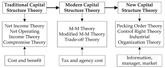 Capital structure indicates the amount and ratio of debt and equity funds during the corporate financing stage, which is a dynamic and complicated process [24]. It can be divided into three categories: Traditional capital structure theory, modern capital structure, and new capital structure theory, which is shown in Figure 1.