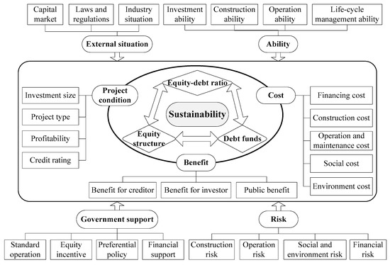 In previous research, Du et al. [11] explored the critical factors influencing the capital structure of PPP projects from a sustainability perspective using literature analysis and qualitative comparative analysis (QCA) methods. They indicated that cost, benefit, project conditions, the external situation, ability, government support, and risk are seven core factors when selecting the capital structure of PPP projects. Based on the results of QCA, a framework of the seven factors and their indicators is proposed as Figure 2 [11], which is a base of this study.