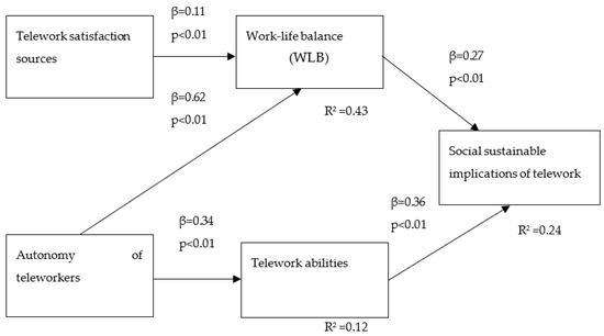 The autonomy of teleworkers has a positive influence on work–life balance, with a path coefficient of β = 0.62, p < 0.01. The autonomy of teleworkers and work–life balance are strongly positively related. Thus, the more employees perceive a greater autonomy associated with telework, the more they have a better work–life balance. Consequently, hypothesis H2 is supported by the results. The sources of satisfaction associated with telework and the autonomy of teleworkers contribute significantly to work–life balance, the coefficient of determination being R2 = 0.43. Thus, the two variables explain 43% of the variation of work–life balance variable.