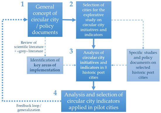 Since the research and practice with respect to circular cities are still in an early stage of development [28], it has been considered appropriate to apply a methodology based on a mixed deductive and inductive approach, following four main steps from general and theoretical frameworks to practice, and back through feedback loop/generalization of findings (see Figure 1):