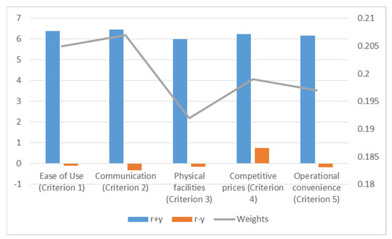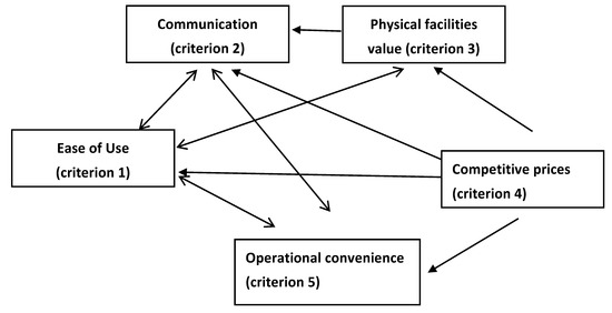 | Criteria Set | Ease of Use (Criterion 1) | Communication (Criterion 2) | Physical Facilities (Criterion 3) | Competitive Prices (Criterion 4) | Operational Convenience (Criterion 5) |