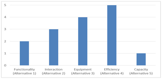| Criteria/ Alternatives | Functionality (Alternative 1) | Interaction (Alternative 2) | Equipment (Alternative 3) | Efficiency (Alternative 4) | Capacity (Alternative 5) |