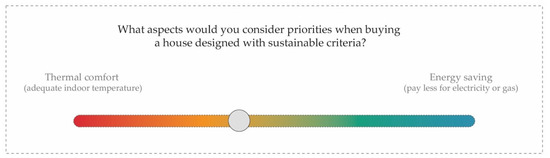 The objective of the survey was to get the opinion of users regarding preferences of economic development versus natural environment at global, national and familiar level; aspects that have an influence in the energy efficiency of houses; the role of promoting energy efficiency of housing; their priorities to buy a house with sustainable criteria; and their socioeconomic status. Consequently, a “bipolar or contrapositive format” was used to design questions, which allows identifying compensatory effects in issues that usually are rivals (Table 3). The visual representation of the questions for the respondents was a “slider scale”: a bar with the rival issues at each end, where respondents use a slider to position themselves within the two extremes for each specific question (Figure 1).