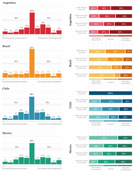 While Brazilian users show a tendency to look for a balance between environmental conservation and global financial concerns, in Argentina, most users situate their priorities towards economic growth. Chilean and Mexican respondents are evenly divided between environmental preservation and economic growth; although in the case of Chile, the respondents tend to find equilibrium between these rival issues (Figure 2). When responses are disaggregated by age, these differences appear to be more apparent. In Brazil, environment preservation seems to be relevant for all ages, but visibly it takes more preponderance for younger users (60%). This happens in Chile as well, where priorities are very different for people older than 65 than users between 18 and 30 years, where a 100% of the former considers economic development as the main issue and only 32% of the youngest rates economic issues as the primary concern. In Argentina, on the other hand, although economic development rates high in importance for all ages, it appears to be crucial for the younger generations (53%). Finally, in Mexico, 67% of users older than 65 years old considers environment preservation as critical, while only 20% of the youngest respondents believe the same. These responses might have been influenced by a perception of environmental degradation in the case of Brazil (e.g., Amazonas river) and Chile (e.g., mines, hydroelectric) and economic struggles in Argentina and Mexico (recessions), in past decades.