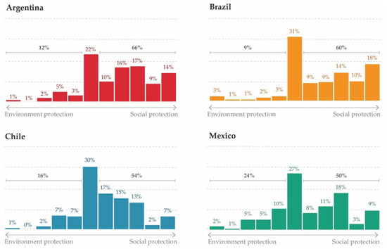 Regarding this question, users from the four countries show a tendency to choose social security (access to education and health) over environmental protection. This decision appears to be more relevant to Argentinian and Brazilian respondents than to Chileans and Mexicans (Figure 3).