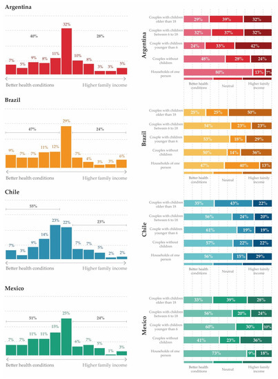 When asked about their family priorities, respondents from the four countries prefer to have better health as the result of lower atmospheric contamination rather than having a higher income. However, there are some differences in the distribution of the responses. Although most Chilean and Mexican users tend to prefer health over salary, that tendency is more exacerbated in Mexico while in Chile users tend to situate themselves closer to the centre of the bar (Figure 4). When the responses are analysed considering household composition, there are two main tendencies: while respondents living in a household of one person tend to choose health over salary—80% in Argentina, 47% in Brazil, 56% in Chile and 73% in Mexico—households formed by couples with children older than 18 years old rate health very low in comparison other household compositions.