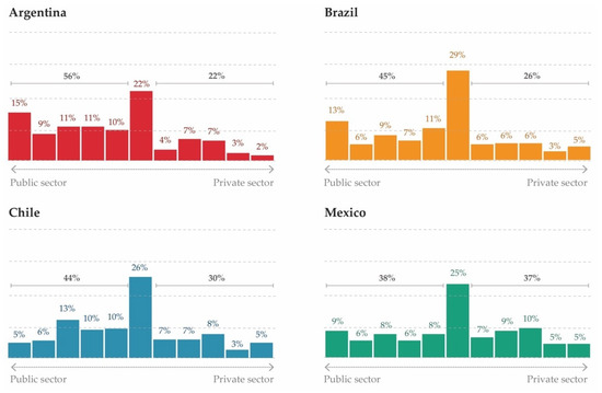 Regarding the responsibility of promoting the energy efficiency of housing in their country, most Argentinian respondents consider the government to have a primary role (Figure 5). This opinion is not shared by Mexican users, who in turn divide their responses evenly between the government and private companies (real state). On the other hand, surveyed respondents from Brazil and Chile show similar answers, because many users (around 45%) express a tendency to give that role to the state, while others give that responsibility to private companies (around 30%).