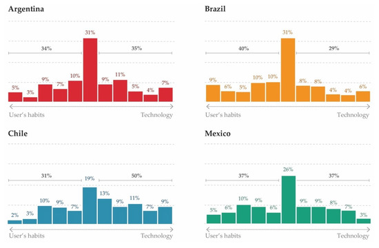 Users were asked about the influence of their habits, such as the turn of the lights off when nobody is in a room, versus building and technologic aspects, such as the type of windows and walls or heating/air conditioning systems, in the energy efficiency of the house. Users in Argentina, Brazil and Mexico show similarities because the responses are evenly spread along the bar. However, respondents from Chile show a strong tendency to give that role to building and technologic aspects (Figure 6).