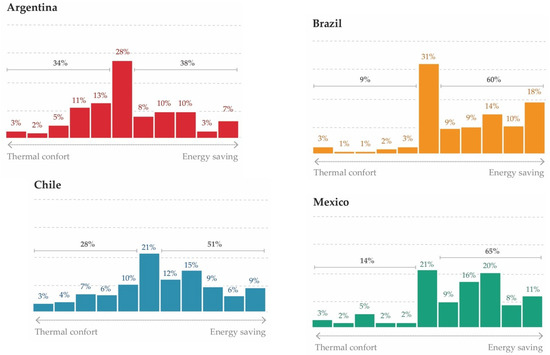 Concerning this question, answers in Brazil and Mexico show a similar tendency to prioritise energy saving (paying less for electricity) instead of thermal comfort (having an adequate indoor temperature). Most Chilean respondents also select energy saving as the main factor. However, an important number of users also consider thermal comfort in their responses. Different are the answers from Argentinian users, who show a balance in their responses, giving to thermal comfort an important role (Figure 7). The answers could be explained by climate differences between the countries studied, where Brazil and Mexico have warmer temperatures than Chile and Argentina. Although this depends on the location of the city, in each country, most responses are from the capitals, which have very different climates.