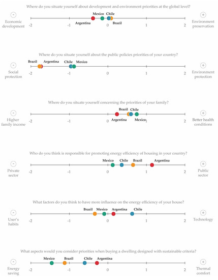 In order to understand the reaction of consumers to energy efficiency and sustainable attributes, a survey was applied to consumers from Mexico, Brazil, Argentina and Chile. The paper explores the opinions of homebuyers from these four countries, analysing their opinions on sustainability, energy efficiency, and the role of the state versus the individual role, among other issues. Significant findings are observed, such as the relationship between the macroeconomic context and responses to energy efficiency, or the relationship between habits and the adoption of constructive technologies concerning economic growth, where a direct and quantifiable relationship is observed. In addition to this, there is a significant difference between Chile—which has an established neoliberal economy—and countries that have economies in transition, where the concept of energy efficiency can be understood as a collective effort rather than an individual one. Also, there are different views on the role of the State, and the houses thermal comfort, which is considered a matter of rights and habits rather than a mere technological problem. From the results, it can be observed that the countries, despite their common cultural origin, do not have significant differences between the factors associated with the preservation of the environment as opposed to economic growth. In this sense, the conditions of economic growth, based on a process of industrialisation and exploitation of raw materials, allow to visualise a higher preference towards spending on technology as an approach to energy efficiency and therefore a process less focused on the habits of use by the inhabitants.