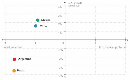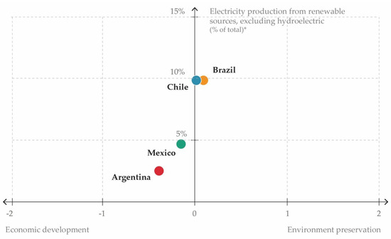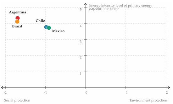 Figure 9, Figure 10, Figure 11, Figure 12, Figure 13 and Figure 14 show a comparison of these new indicators with data from the countries available from the World Bank [80], through a series of perceptual maps. In all cases, it suggests some formation patterns between the weighted indicator and aspects such as electric power consumption and economic data, among others. In this sense, when comparing the values with the production of electricity based on renewable energies (Figure 9), we can hypothesise that there exists a discourse related to the generation of clean energy that can impact on the trend toward environmental preservation. Similarly, when comparing the indicator of income share held by the highest 10% of the population regarding environmental preservation, there is a tendency to favourably evaluate environmental preservation when this participation is higher (Figure 10). On the contrary, annual GDP growth has a positive relationship with valuing environmental protection rather than social protection, a result consistent with the expected perceptions in developing societies, with industries focused on the exploitation of raw materials (Figure 11). If we compare annual GDP with the intensity level of primary energy—associated with an indirect measure of industrial production—there is a relation with greater social protection that could be explained due to higher levels of industrialisation (Figure 12).