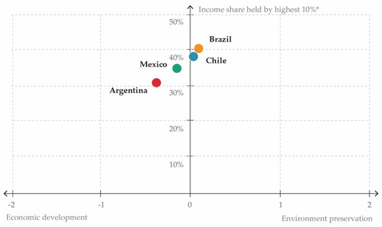 Weighted analysis indicator for the question: Where do you situate yourself about development and environment priorities at the global level? versus income share held by highest 10% for the years 2015–2016 by country according to The World Bank [80]. (*) Source: World Bank, Development Research Group. Data are based on primary household survey data obtained from government statistical agencies and World Bank country departments.