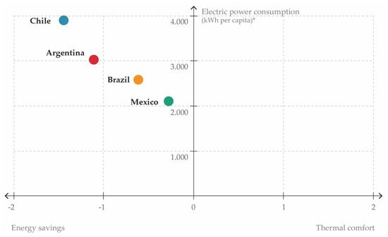 Regarding the assessment of technologies as an approach for improving the energy efficiency of buildings, this has a direct and positive relationship with income, expressed through the GDP per capita (Figure 13). This finding can be considered as expected, but difficult to manage because the user´s habits also represent a relevant aspect of achieving the optimum efficiency of a dwelling. However, there is also a correlation between electric power consumption per capita and appreciation for energy savings rather than thermal comfort as priorities for buying a house designed with sustainable criteria (Figure 14), which is also expected.