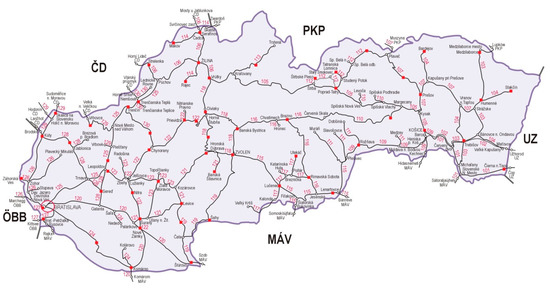 - ŽSR (Railways of the Slovak Republic) ELIS—search engine of timetables in Slovakia Železnice Slovenskej Republiky, Slovak Republic. 2017. Available online: https://www.zsr.sk/pre-cestujucich/vlakove-spojenia-elis/ (accessed on 14 April 2017).