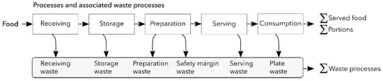 Past food-waste studies seldom include all waste processes within a kitchen establishment. The most commonly included processes are “Plate waste”, “Serving waste”, and “Preparation waste” [26,39]. Figure 1 sets the different definitions in Table 2 in context and indicates where the different waste processes usually occur.