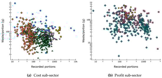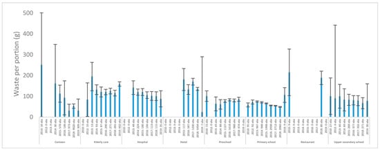Comparing the results for “Waste per portion”, aggregated on kitchen level for all available data according to the strictest criterion (Table 7) against the average number of reported portions (Figure 4), revealed that preschools as a segment typically serve fewer portions than e.g., upper secondary schools, but displayed quite a broad range of “Waste per portion”. Upper secondary schools, on the other hand, serve rather many portions but were quite consistent in their “Waste per portion” levels. Primary schools occupied an intermediate position, with 490 recorded portions and 60–70 g per portion, and showed a similar pattern as upper secondary schools, but with somewhat lower “Waste per portion” levels and a broader spectrum of recorded portions. Elderly care units rarely go under 100 g per portion, with some exceptions, and serve quite a broad range of portions on average. Hospitals show the same characteristics as upper secondary schools, but with a higher number of recorded portions. Canteens display quite a broad range in terms of both number of recorded portions and average waste per portion, while hotels have slightly higher average waste per portion. Restaurants are quite few, but centered on 200 portions and quite high waste levels, ranging between 100 to 200 g per portion.