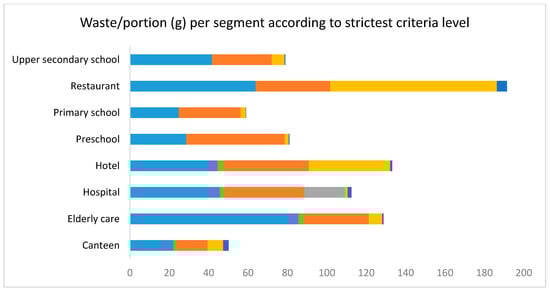 To get an understanding of how the waste quantifications for the different segments were distributed and to identify where the main waste occurs, the “Waste per portion” indicator obtained with the strictest criterion (Level 1) was used.