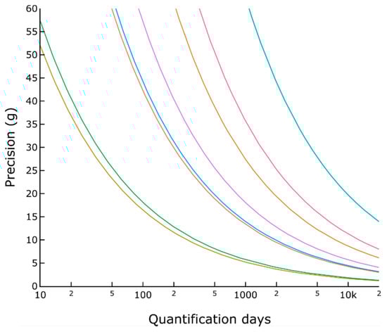 Measurement precision in the key performance indicator “Waste per portion” and number of quantification days for hospitals (—), primary schools (—), preschools (—), elderly care (—), upper secondary schools (—), restaurants (—), hotels (—), and canteens (—).