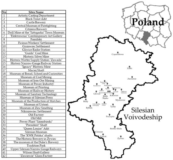 IMR was established in 2004 by Marshal’s Office of the Silesian Voivodeship, which has managed the route since its creation, up to this day. IMR is a thematic car route that covers the monuments of industry within the entire voivodeship. At the time of the conducted studies, the route included 42 sites located in 27 towns and cities. The map and list of IMR sites is presented in Figure 1.