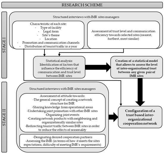 The main study was divided into two phases. In the first phase [65] structured expert interviews with managers of all IMR sites were conducted. During the interviews an overall characteristic of each site was made (theme of the site, available attractions and services, years of functioning, legal form of organisation, number of employees, the dimension of tourist traffic). Then each subject was asked to assess the trust level and communication efficiency with 9 other sites (3 of them were the nearest, 3 the furthest, and 3 most similar institutionally). The data was also supplemented with attitudes in each given site towards the process of networking and cooperation development within IMR. Then all the gathered data was analysed in order to identify the features and attributes of IMR sites that affect the inter-organizational trust among them. Finally a statistical model was created, it allowed to assess the trust level between any given IMR site.