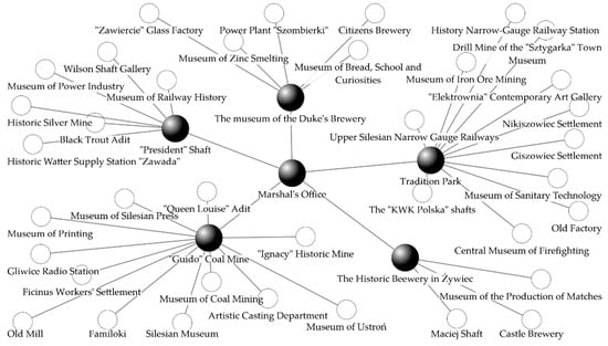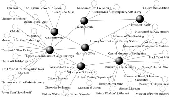 The result of the presented approach was the selection of five brokers in the created network model. Two private sites (The Museum of Duke’s Brewery and The Historic Brewery in Żywiec), two public entities (“Guido” Coal Mine and the Tradition Park) and one site of the third sector (“President” Shaft). The map of relations of IMR sites with brokers in the proposed network is presented in Figure 3.