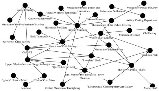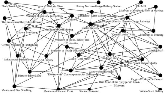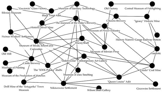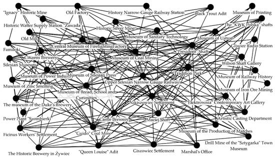 Another basis for establishing network relations was the willingness to create network products with other entities on the IMR, expressed by the respondents, which either feature high probability of the conducted activity or are located near each other. In this case, connections between the sites were introduced into the network model if the three following criteria were met: distance between the connected network actors was smaller than or equal to 13.2 km (lower quartile of the distances dividing the studied units), the estimated trust between the partners met the criterion of the upper quartile, the assessment of the attitude to creating network products with the neighboring entities obtained in the studies in the two sites exceeded 5 (a scale of 1–10 was used, where 5 stood for neutral attitude, and higher value expressed willingness to such effort). This way, 34 network relations were determined. Moreover, 26 network relations between sites with large institutional similarity (15 relations connecting museums, 8 connections between sites with a common theme that is transport in mining, and 3 relations pairing two mines, two settlements and two breweries).