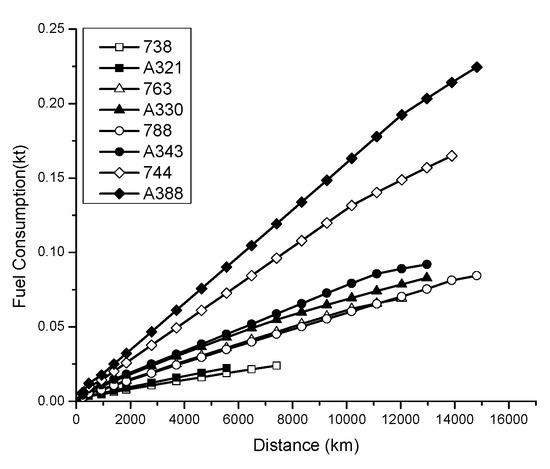 Theoretical fuel consumption of different aircrafts by flight distance.