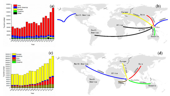 The international air transport passenger numbers have increased over time in both island countries, indicating the booming of tourism sector. As shown in Figure 2, number of passengers to Palau increased from 64,000 in 1998 to 162,000 in 2015, while that to Seychelles increased from 130,046 in 2000 to 303,177 in 2016. The average GCD values from the paired airports in different continents are plotted in Figure 2b, where the direction of arrows shows the passengers’ origin, and the colors of the arrows correspond to the different continents. In general, most of the passengers came from the nearest continents, as passengers from Asia and Europe formed the largest percentage of passengers to Palau (92%) and Seychelles (76%), respectively. The percentage of passengers coming from different continents remained almost the same. However, it was noted that the number of passengers from Asia to both Palau and Seychelles increased significantly.