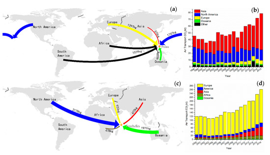 Figure 3a,c shows the emission per capita of international air transport passengers to Palau and Seychelles from different continents. The colors of the arrows are consistent with the continent legend, and width of the arrow represents the emission amount. For Palau, the emission per capita of European passengers was the highest (1297 kg) while the lowest CO2 emission (370 kg) was from each Asian passenger. For Seychelles, the emission per capita of American passengers ranked the first, and every passenger caused 2178 kg of CO2 emission in their journey, while passengers from Africa caused the least emission per capita, of only 478 kg.
