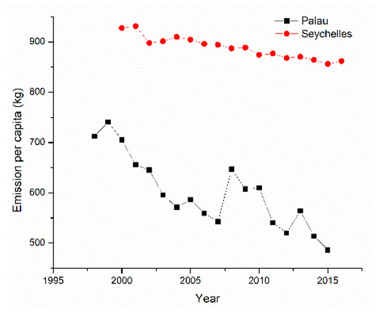 As shown in Section 3.1, the main determining factor for the aggregated emission per capita is the distance—the longer the distance passengers are from the two islands, the greater the emission they will bring. However, it was found that the component of international air transport origin is also important to the aggregated emission per capita. With the increase in Asian passengers in recent years, Asia brings the second largest CO2 emission, even though its emission per capita is the least among the five regions of origin. In Seychelles, although the emission per capita from America ranks the first, the total emission from America ranked the third in 2016 because of the low passenger number. Therefore, as shown in Figure 6, in Palau, the boost of Asian passengers led to the decrease in aggregated emission per capita (2% per year). In Seychelles, on the other hand, the decrease in aggregated emission per capita was slower (0.5% per year) than that of Palau because of its consistent passenger origin component. This phenomenon is in accordance with the conclusion made by Gossling [26], that the emission of island tourism can be influenced by the management of market directions. However, in this study, the aggregated emission per capita was taken as a constant value when the future emission of these two islands was estimated, which may bring some uncertainties in the future emission prediction of the two islands.
