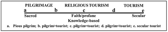 Within this blurry relationship between pilgrimage and tourism, religious tourism may be associated with the individual quest for shrines and locales, where visitors seek to experience a sense of identity with sites of historical and cultural meaning [73]. Rinschede [31] proposed that religious tourism is a type of tourism where participants are motivated, either in part or exclusively, for religious reasons; although in current times, religious tourism might be drawing closer to tourism types that might be less or non-religious, such as heritage or leisure-based tourism. On Smith’s [58] pilgrimage–tourism continuum, religious tourism lies in the center with a balance, arguably more representative of the contemporary religious experience. Even though Smith’s continuum or previous literature does not offer clear distinctions between pilgrimage and tourism, the common argument point is the increasing complexity of the relationship between these phenomena.