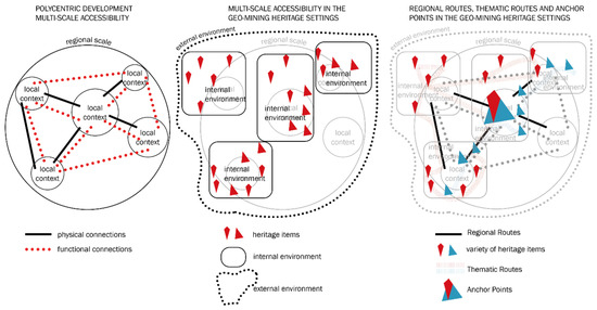 Figure 2 exemplify, through three different stages, development steps of the interpretative and methodological framework for landscape accessibility in Geo-mining heritage settings. Illustrated stages merge key principles of ‘polycentric development’ with the context of heritage and principles proposed by “ERIH”. Internal and external environments are defined in overlap of those principles. However, it is fundamental to observe and map all highlighted principles parallel.