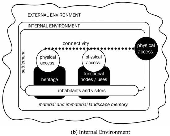 The proposed Environmental model: (a) External environment produces a territorial matrix linking the common variables of the internal environment. Some parts of the internal environment could have a more developed or important variable than the other parts. In this case, the internal environment becomes ‘point of interest’ or reference spot for the examined variable, anchor point of the territorial matrix. (b) Internal environment scheme lists the components of the nodes that have to be accessible from the outside environment and within the inside environment.