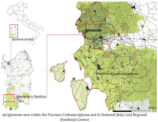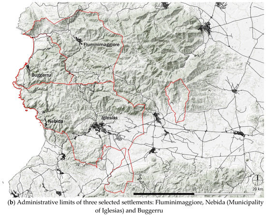 Context and Boundaries of the Iglesiente area: (a) Iglesiente area within the Province of the Carbonia-Iglesias and the Carbonia-Iglesiente and Guspinese-Arburese areas of the Geo-mining Park within the National (Italy) and Regional Context of the Geo-Mining Park in Sardinia; (b) Administrative limits of three selected settlements for further research: Fluminimaggiore, Nebida (Municipality of Iglesias) and Buggerru.
