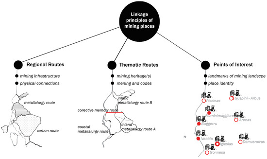 The Iglesiente area is particularly rich with items that permeate the whole territory with mining heritage; including mines, facilities and aspects related to their Millenary activity. It covers approximately 480 km2. In the same area, Iglesiente has the oldest Italian paleontological formations (Geological Heritage) and archaeological evidence since the Neolithic, Punic and Roman periods (historical heritage). An explicit and sophisticated interpretation of heritage values requires vast knowledge about the landscape, high deductive capacity and artistic interpretation. The essence of the Geo-mining heritage is the spatial continuity of the mining activity even though the items of the system can be physically distant [40]. Physical distance and spatial distribution of Geo-mining heritage (scattered and isolated heritage items over the landscape and underground) assume variant perception of information. Also, physical prerequisites of heritage items presume combination of transportation means to reach the items. Accordingly, planning and interpretative expression of heritage values must restore adequate knowledge and respond to a modality of active mobility. The knowledge to provide involves both, regionalization of experience and localization of identity and tradition; particular spaces at multiple scales [6]. Not only multiple scales but also these particular places have to demonstrate multiple values. Guided by a good example of practice in the field of networking the industrial heritage, we hypothesize “ERIH” networking principles at the area of Iglesiente. In this regard, if we scale down the “ERIH” system at the level of Sardinia, the first step would be distinguishing ‘key sites’ and the second to establish two types of routes. Based on Regional Routes, Thematic Routes and Anchor Points, without deeper investigation of attributes, Figure 5 summarizes and illustrates the principle of networking applied in the case of the Iglesiente area of the Geo-mining Park in Sardinia.