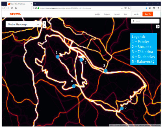 The position of counters can be seen in the Figure 2—the map is based on the data of Strava (Heatmap [61]).