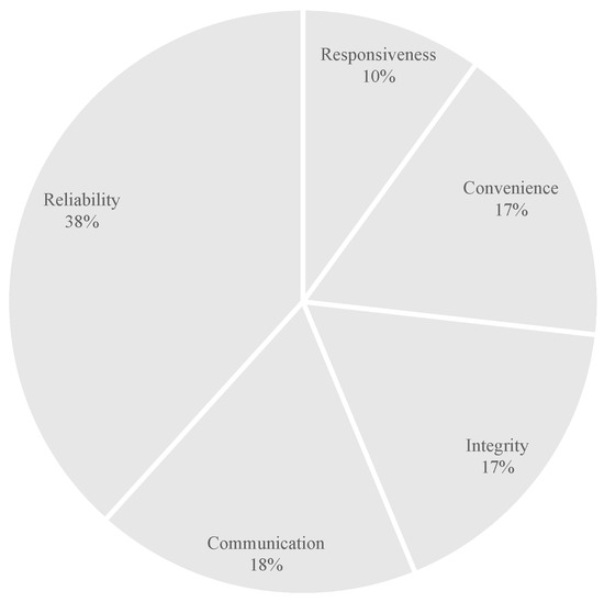 After classification of the 2000 reviews on logistics, 199 were concerned with the responsiveness of logistics services, 337 regarded the convenience of logistics services, and 340 were particularly about the completeness of the logistics services. A total of 357 customer comments focused on the communication of the logistics service, and 767 were concerned about the reliability. Figure 3 presents the factors that affect customer satisfaction.