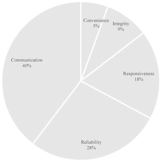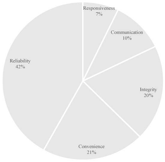 Of the 1500 favorable reviews on logistics, 108 were concerned with the responsiveness of the logistics services, 159 were on communication, and 295 on integrity. A total of 309 customer comments were on the convenience of the logistics services, and 629 about reliability. Figure 4 presents the proportion of favorable factors.