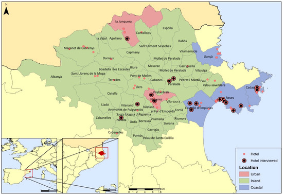 This case study was conducted in the Muga river basin located in Girona, north-east Spain. The basin encompasses a surface area of approximately 1130 km² and has 52 villages, towns, and cities. It has three geographically distinct areas that attract different types of tourism (Figure 1). The first area is coastal, and hotels in this area are mainly located in the resort towns of Castelló d’Empúries, Roses, Cadaqués, and Llançà; 64% of the hotels are small (<50 rooms), 26% are medium-sized (51–150 rooms), and 10% are large (>151 rooms). The hotels are family run and business is highly seasonal, with most tourists arriving between April/May and October.