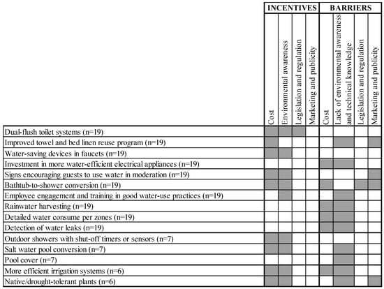 Main incentives and barriers to the implementation and fostering of water-saving measures perceived by hoteliers interviewed.