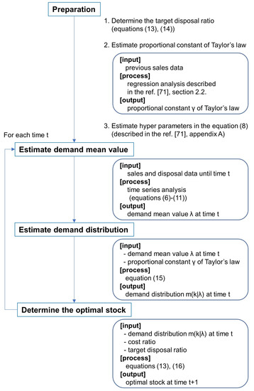 Our aim and contribution are to provide a practical solution for demand estimation and stock management under non-stationary and censored demand, which realizes food waste reduction keeping high profit. We recently proposed a non-stationary time series analysis method [71] which is suitable for sales data analysis since it incorporates a recently discovered nature of the fluctuation of the sales data, namely, Taylor’s law [72]. Specifically, the sales process is basically the Poisson process of which fluctuation width is known to be the square root of the mean, however, the fluctuation width is proportional to the mean when the mean is large, which is caused by the effect of fluctuation in the population (customer) [73]. Our study [71] shows that the parameter (demand) estimation of non-stationary sales data without considering Taylor’s law leads to a misreading of the abnormal fluctuation in sales data as non-stationary changes of the demand, that results in poor accuracy of demand estimation.