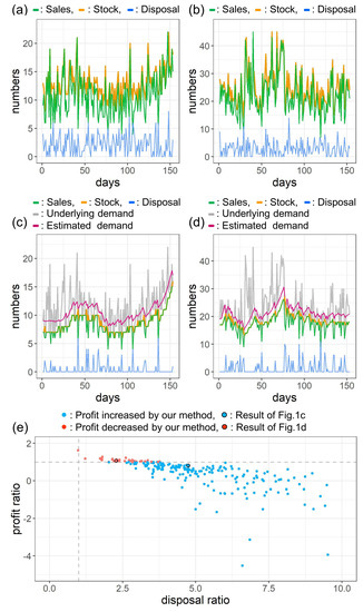 We applied our method to the 215 sales time series mentioned above. In each case daily stock is determined with the Equation (3) using sales and disposal time series up to the day. Figure 2e shows the profit and the disposal of shops for each 215 product, which is normalized as follows. We simulated the daily sales time series with our method for each 215 product, and obtained the total profit and disposal for each product. For comparison, we divide the profit and the disposal of shops by those of our method, respectively. The horizontal axis denotes the total disposal of a sales time series of a shop normalized by that of our method, and the vertical axis shows the total profit of a sales time series of a shop normalized by that of our method. The plots whose value exceed 1 in the horizontal axis, which is shown in the dashed gray line, correspond to the result that the waste amount simulated by our method is smaller than that of actual shops. The blue plots show the cases that the profit of our method is higher than that of real shops, and the red plots show the cases that our method gives lower profits. The results of Figure 2c,d are marked with black circles. We confirmed our method improved profit in 83.7% (180/215) of the plots. The negative value in the vertical axis corresponds to the negative profit of a shop, that results in the negative ratio of the profit. By aggregating the profit and the waste in Figure 2e, the waste of the shops (total amount of waste 103,468) is reduced to 23.2% (total waste 23,967), and the profit of the shops (total profit 8,255,002 yen) is increased to 140% (total profit 11,558,387 yen).