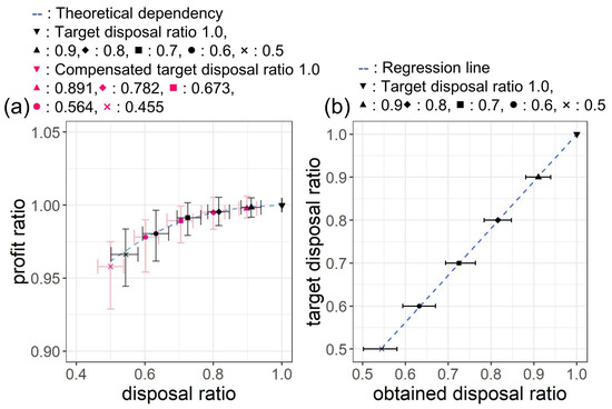 In Figure 3a, the deviation between the target disposal ratio and the obtained disposal ratio is observed, such as the obtained disposal ratio 0.73 for target disposal ratio 0.7 and obtained disposal ratio 0.55 for target disposal ratio 0.5. Though the deviation is relatively small especially for a large target disposal ratio, we can empirically compensate for this deviation by regression analysis with the obtained and target disposal ratio. Figure 3b is the result of the regression analysis. The regression function is estimated to be , where is the target disposal ratio and is the obtained disposal ratio. This function tells the disposal ratio in the sales data analysis is obtained with target disposal ratio , so it can be used to compensate the target disposal ratio to obtain the desired disposal ratio in the sales data analysis.