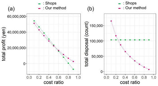 Figure 6a tells the profit and the disposal with our method compared to shops are equivalent at the cost ratio 0.2, and the disposal 59.7% (8247/13,822) with the same profit compared to shops are obtained at the cost ratio 0.4. At the cost ratio 0.7 which is typical for the convenience store, the profit is 208.0% (1,260,691/606,070 yen) and the disposal is 22.4% (3097/13,822) compared to the shops.