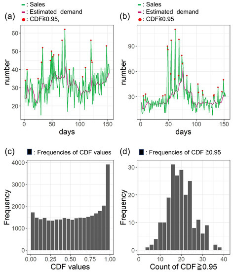 Figure 6c shows the histogram of CDF with the 33 sales time series. The excessive count of CDF greater than or equal to 0.95 is suppressed. Since the data size is relatively small, the histogram appears not to be uniform. To see the consistency with the result and the theoretically expected frequency, we simulated the theoretical histogram with random numbers whose distribution follows Equation (15) and each demand mean is the estimated values for each 33 sales time series. Figure 6d denotes an example of the simulated theoretical histogram, which shows a similar tendency with the result of actual sales data. We confirmed the equivalency of the theoretical and the actual distribution with Kolmogorov–Smirnov test. Namely, the p-value comparing the CDF distribution obtained with the actual sales data, and that of random number simulation, repeated 200 times with changing random number seed, is 0.07 on average, which shows the difference of the theoretical and the actual distribution of the CDF is not statistically significant at the p-value 0.05.