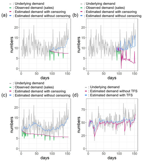 The verification of the method for estimating demand with censored sales time series and its effectiveness for determining the stock for each time is discussed in the Appendix A (Figure A2, Figure A3, Figure A4 and Figure A5).