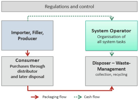 Indeed, extended producer responsibility (EPR) is an increasingly popular instrument for solving SWM problems. It is an environmental approach based on the “polluter-pays” principle, where those who introduce packaging or packaged goods into a country’s market remain responsible for them until the completion of the packaging life-cycle [22]. The extent of producer responsibility depends on the specific model applied and is usually only financial, although in some cases it is also organizational [23]. In this system, companies that introduce packed products into the market are obligated to collect, sort, and recycle the packaging of these goods or dispose of them in an environmentally friendly way as soon as they have reached the end-of-life-phase [22]. According to [24], and as an example of the European experiences related to EPR, Germany collected about 2.4 million tons of lightweight packaging, about 2 million tons of paper/cardboard, and more than 2 million tons of glass via the EPR system. In Belgium, the producer responsibility organization recycles around 90% of all packaging put on the Belgian market annually and by now has created about 2500 job opportunities. In France, the organization was able to gather 9.5 million euros for packaging waste management activities, from the collection, to the sorting and recycling, and recycled 56 million tons of packaging waste. Finally, in Spain since 1998, the organization has managed to recycle 19.3 million tons of packaging and has generated 42,600 jobs in Spain, over 9400 of them direct. It is also important to take into consideration, that there are a multitude of approaches and systems of this kind in many countries, which are referred to collectively as “EPR systems” [25].